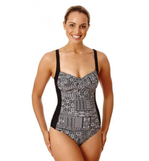 Jessica D Cup Swimsuit in Paseo print from Femme de la Mer. Moulded soft D Cups with adjustable straps and front side ruching. Cross gathering over the busts.