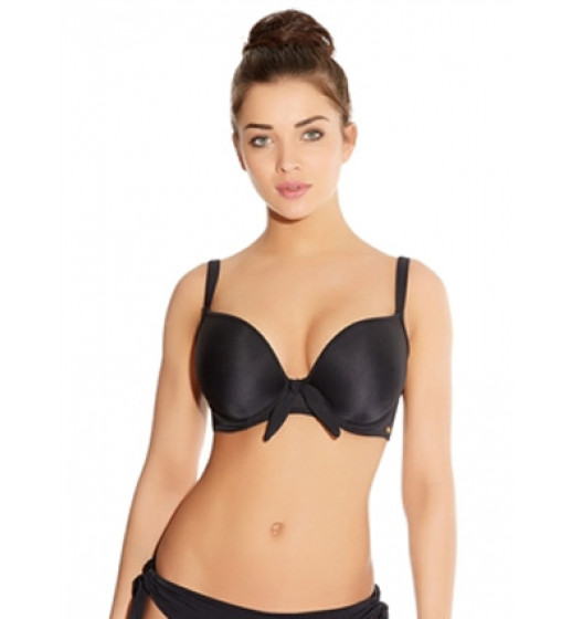 Freya's Deco swim underwire DD bikini top. An incredibly supportive black top that includes moulded soft cups, underwires, adjustable straps and a clip back. It has a small bow detail on the front of the top and would look great with any black or patterned briefs.
