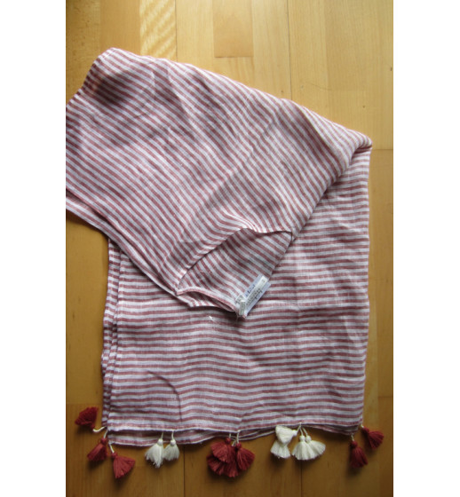 Linen Stripe Kaftan-Rust from Seafolly. Nice Linen Kaftan in a rust and white stripe. Rust and white tassles to match. Style and fit as per the model shot.