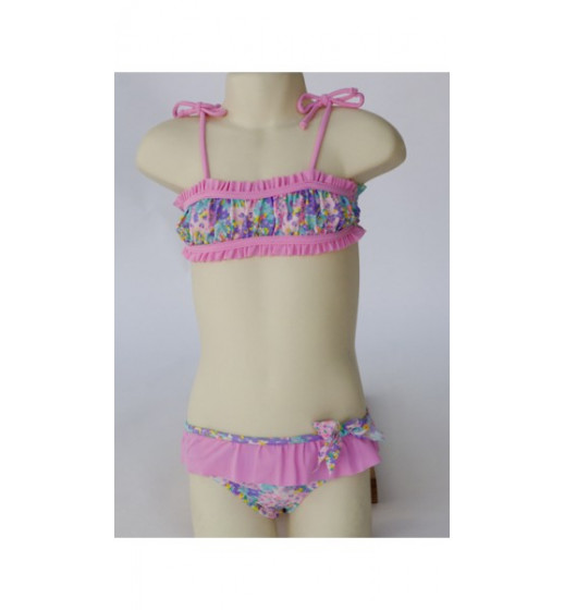 2Chillies Toddler Bikini in a pink print. Double adjustable tie straps on the tube top. Size ia really 0-1yr. Frills, gathers and bows.