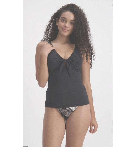 DD/E Tie Front Tankini from Moontide. Removable soft cups set in underwires with adjustable straps and a tie front.