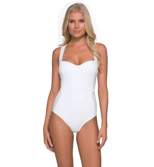 Infinity Swimsuit -White from JETS. This has been a great white swimsuit when we have been able to get it. Moulded soft cups with soft cross over back straps and mesh side detailing.