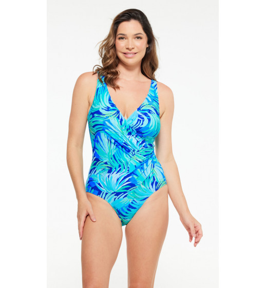 Havana Surplice Swimsuitf from TOGS. Classic cross over front styling with soft cups set in a shelf bra with front power netting. Wide adjustable straps with cross over front gathering.